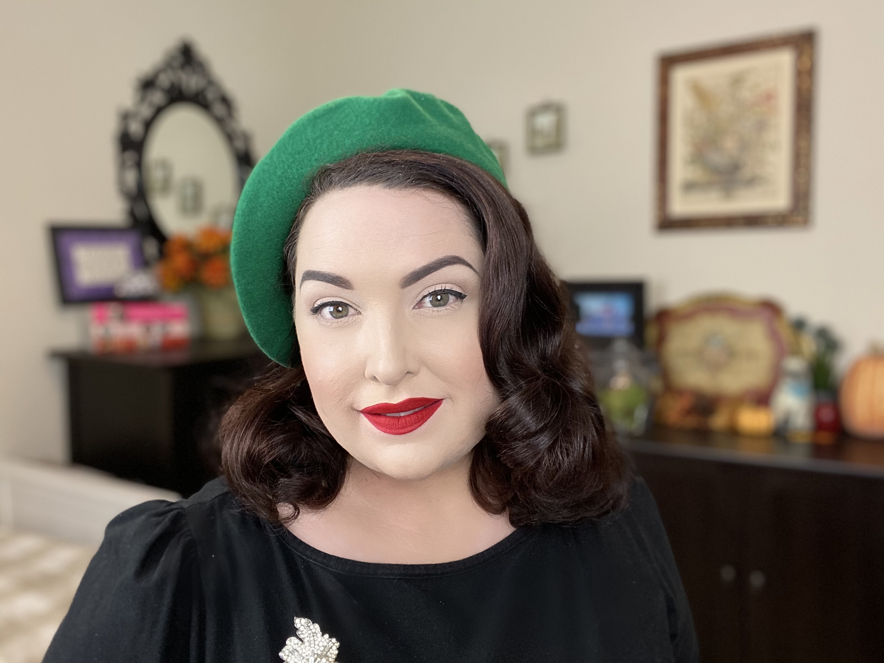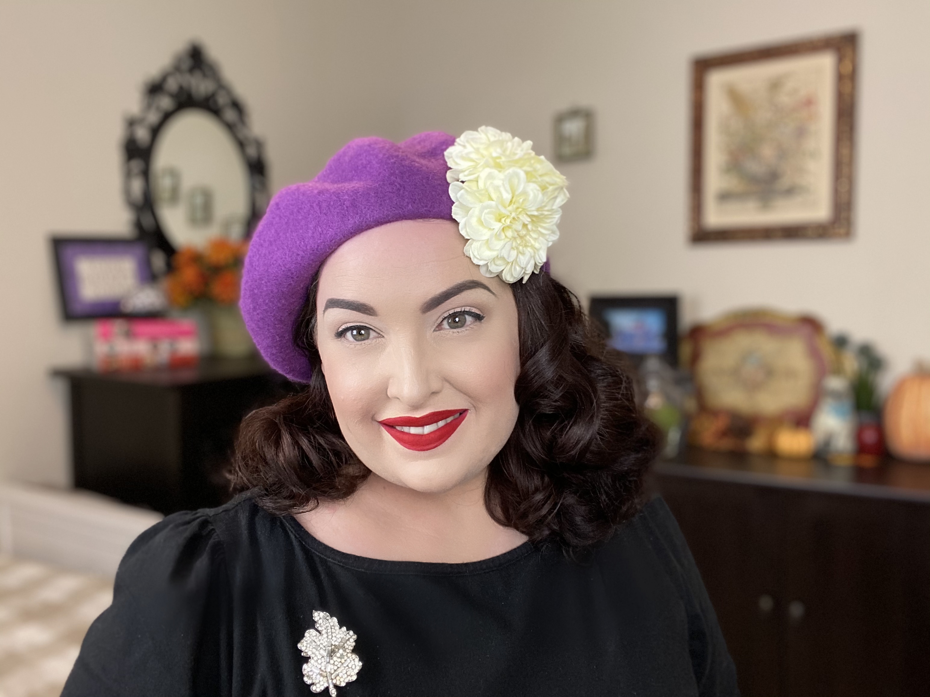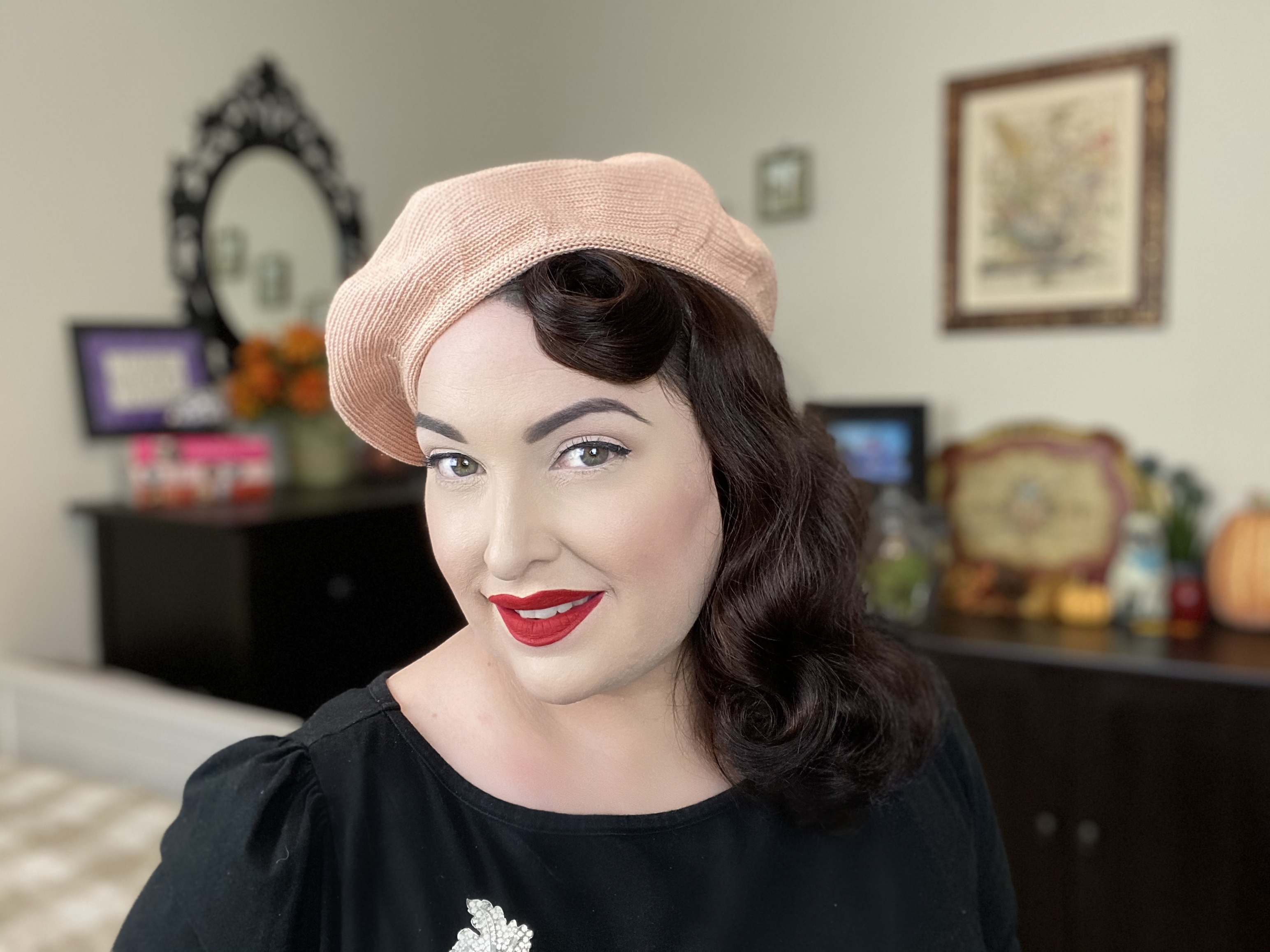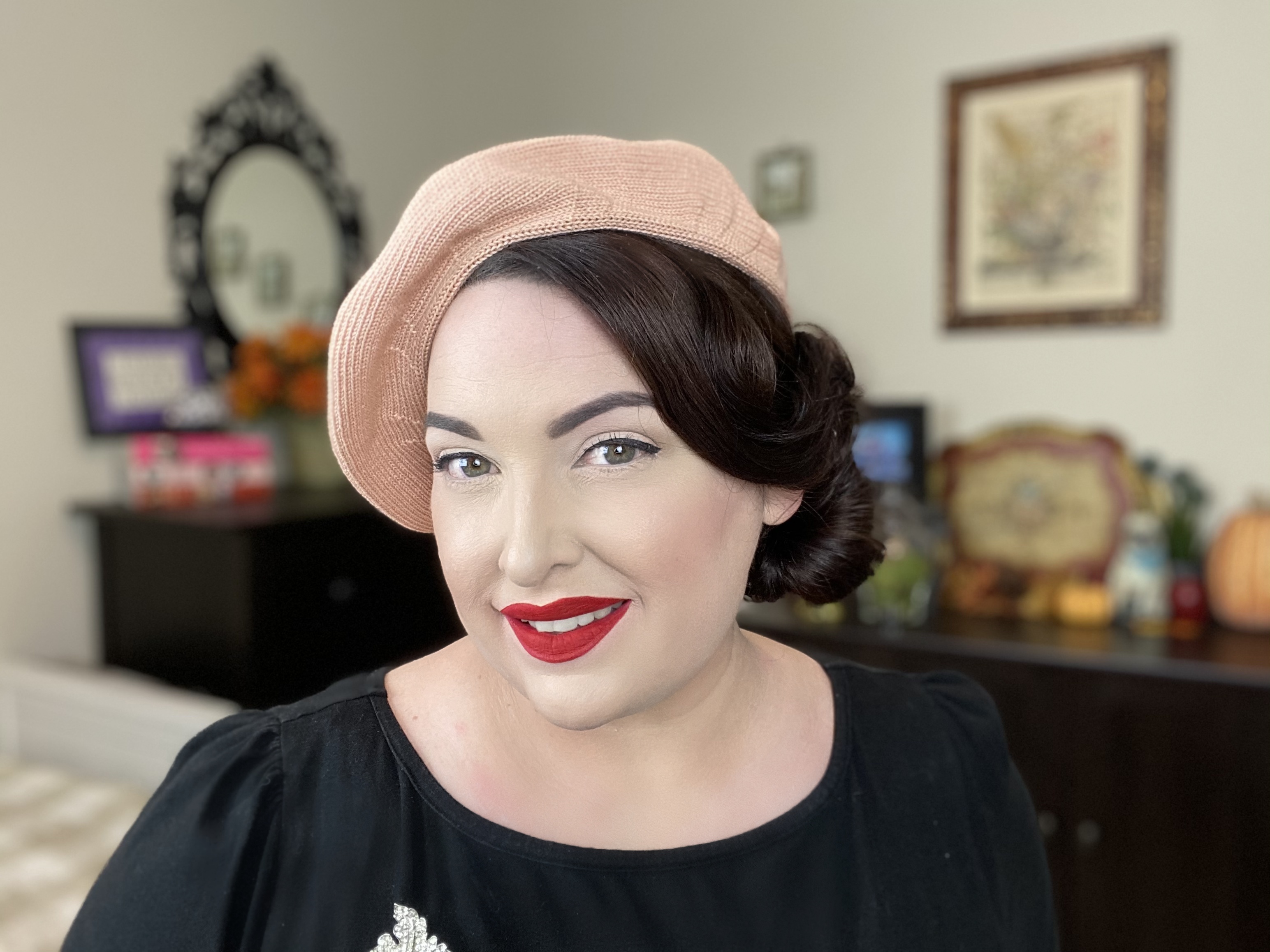 You can style your hair in many different ways and use the beret to showcase a pin curl, roll, curls or swoop.